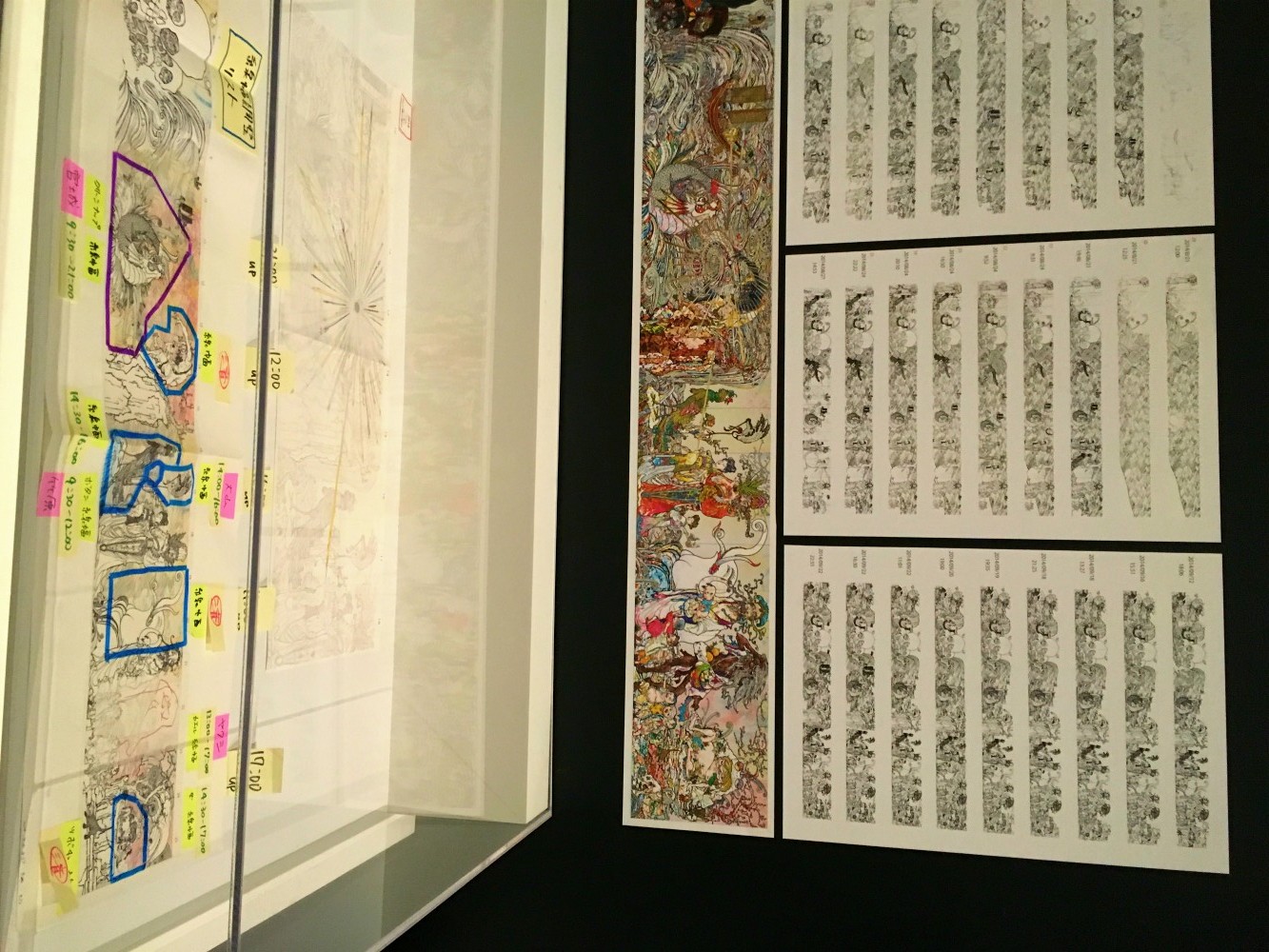 One of my favorite parts of the exhibit was the breakdown of how Murakami comes up with characters, which is where I really started to understand how similar his works are to traditional Japanese scroll paintings. It's all in the process. Layers of characters and background elements are printed on top of each other, perfecting one figure before moving onto the next, creating a composition where all elements work seamlessly together. It has to be a painstaking process, but it's amazing to me that the same processes that worked for Edo artists are how Murakami chooses to work today (though he does have a herd of assistants and modern technology that help him produce his works to absolute whimsical perfection.